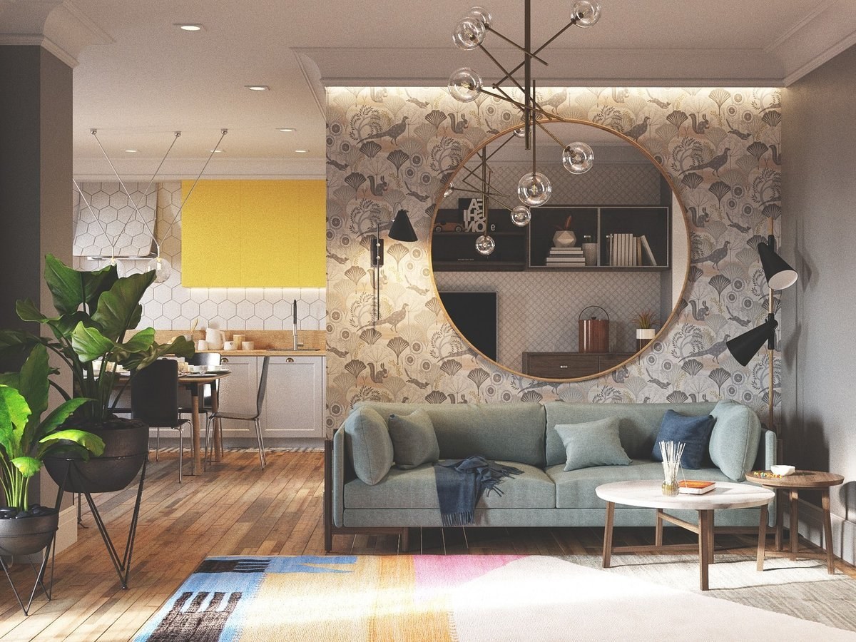 Зеркальное панно в интерьере гостиной
