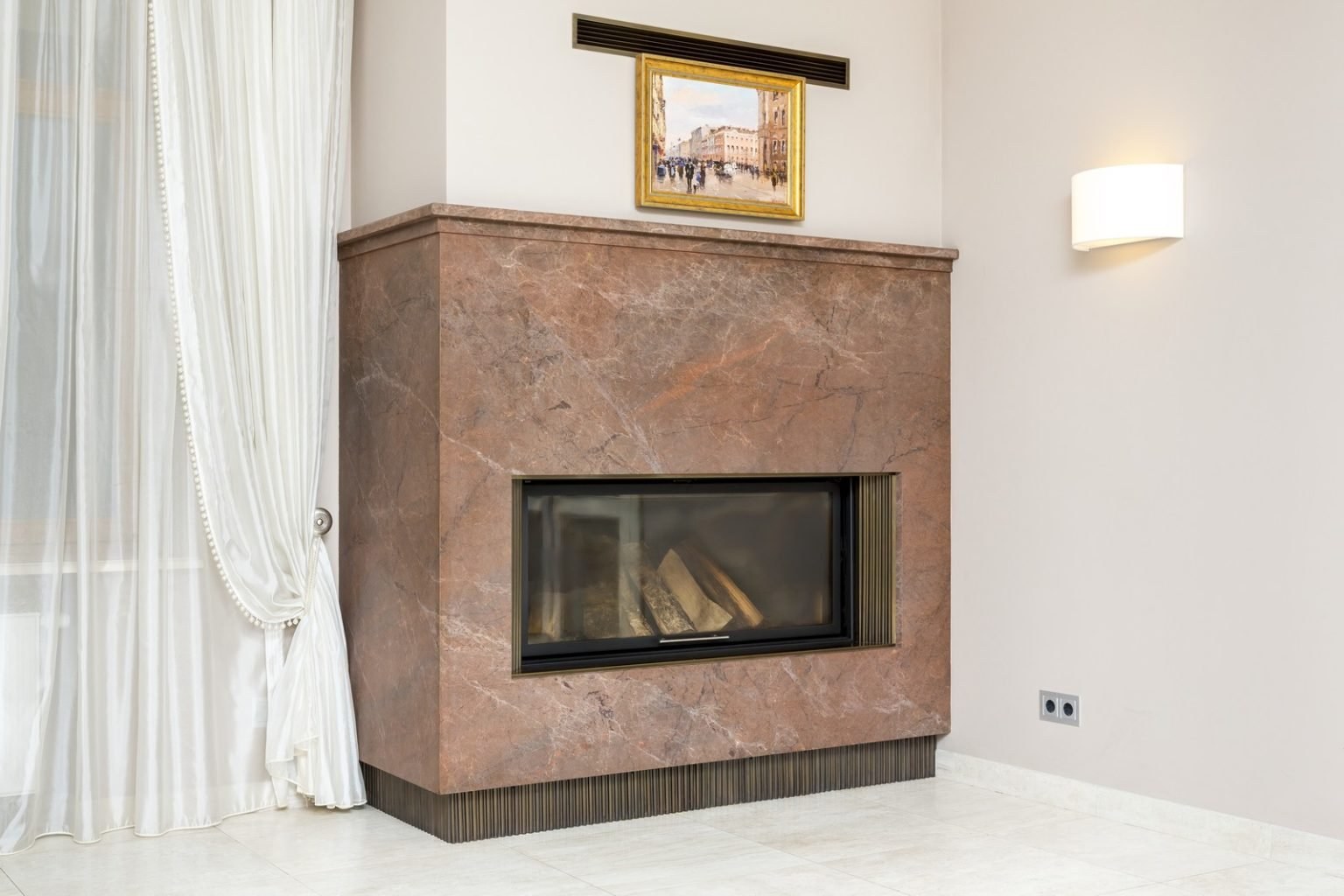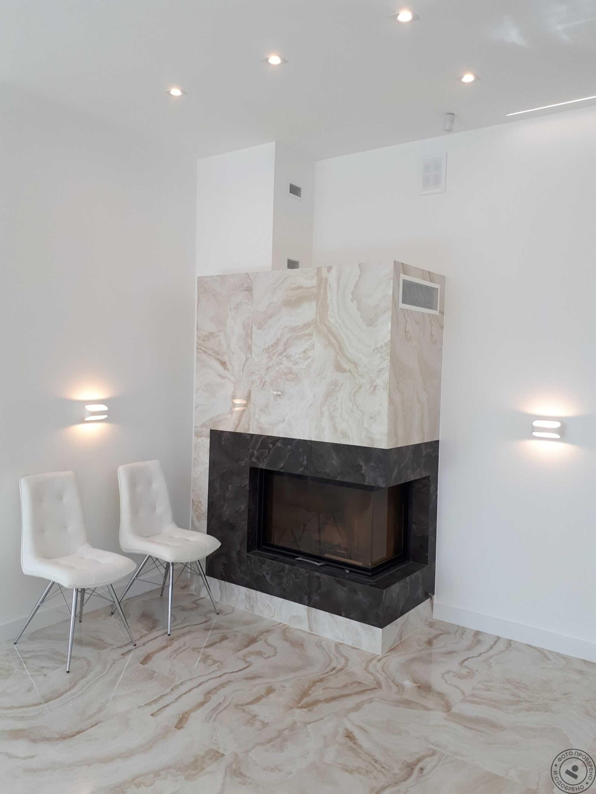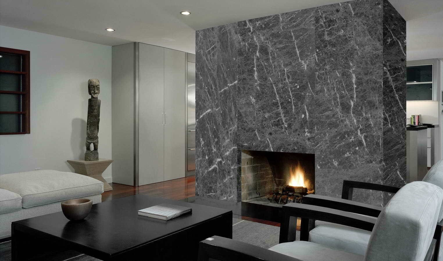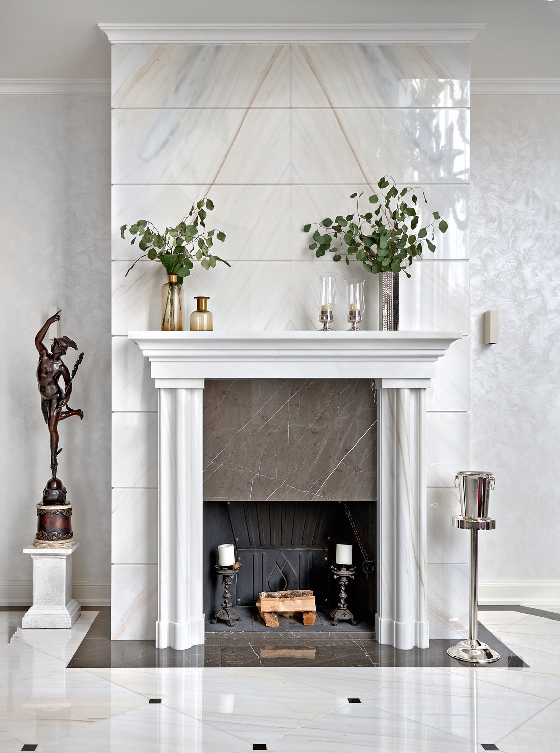 Отделка камина керамогранитом под мрамор в интерьере