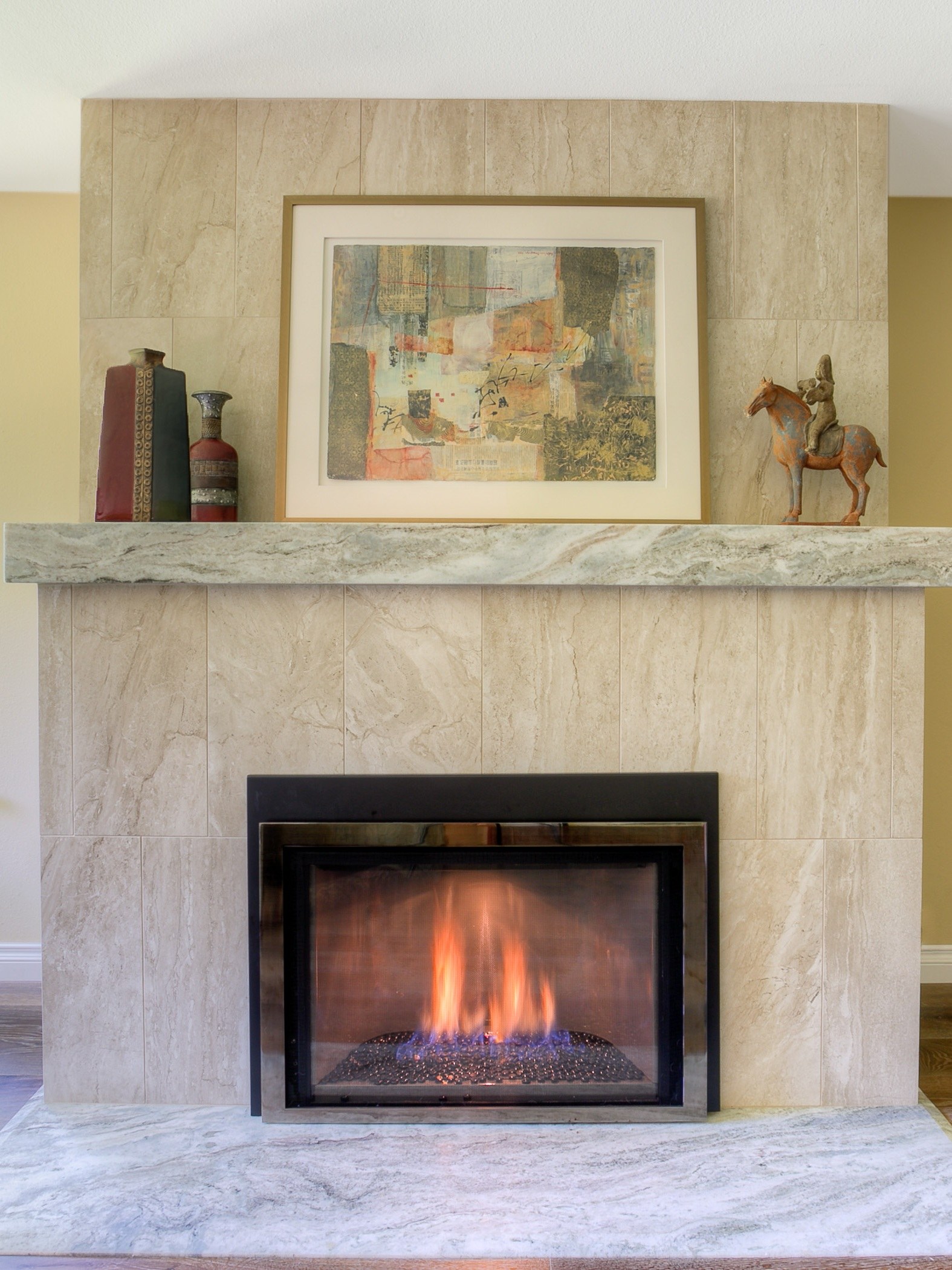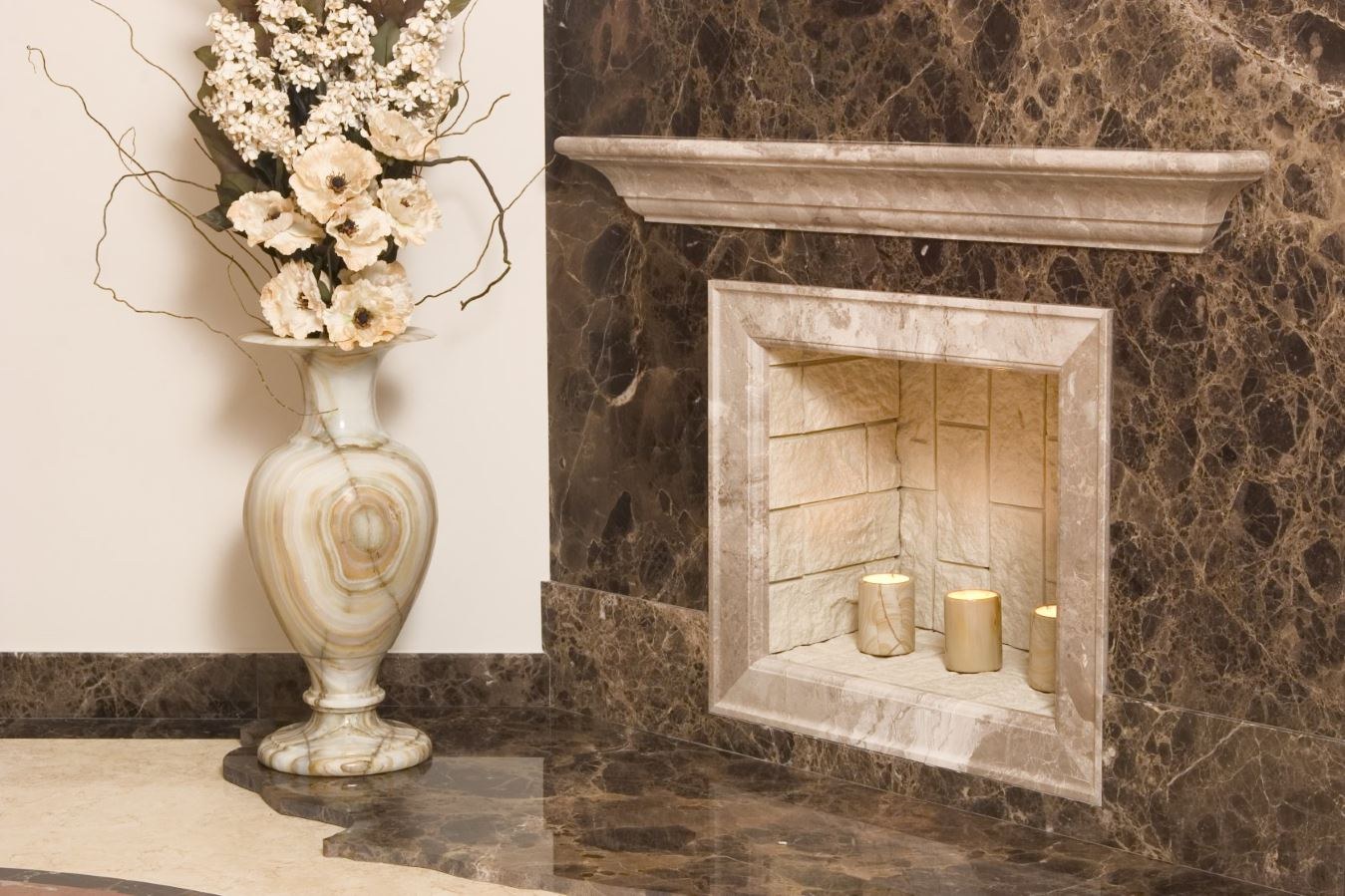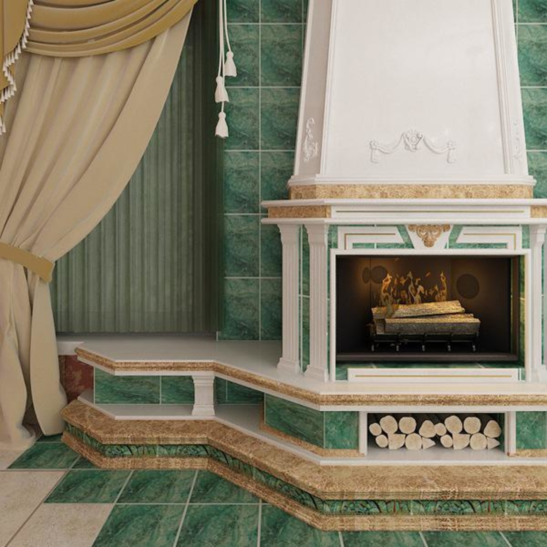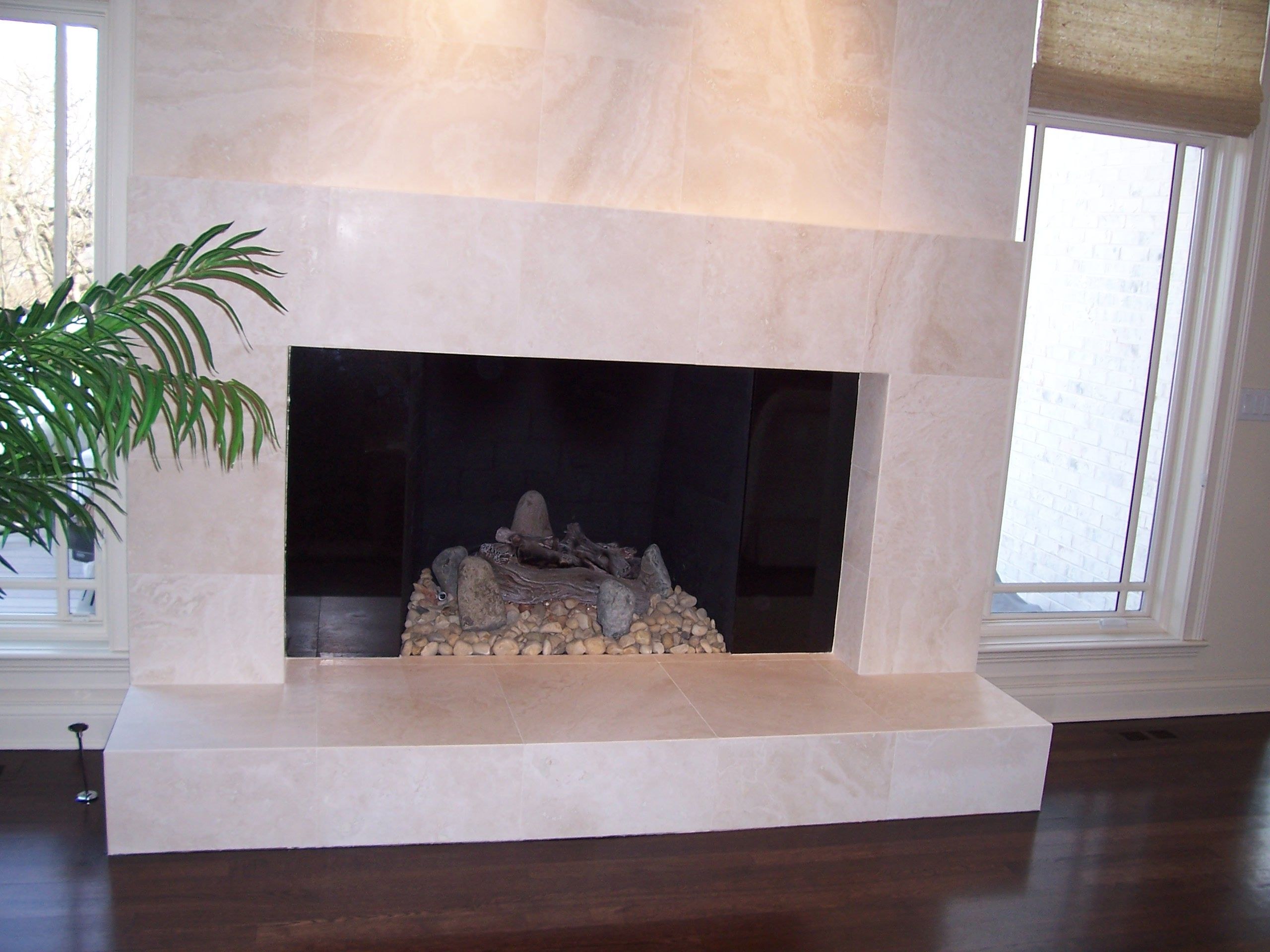 Отделка камина керамогранитом под мрамор в интерьере