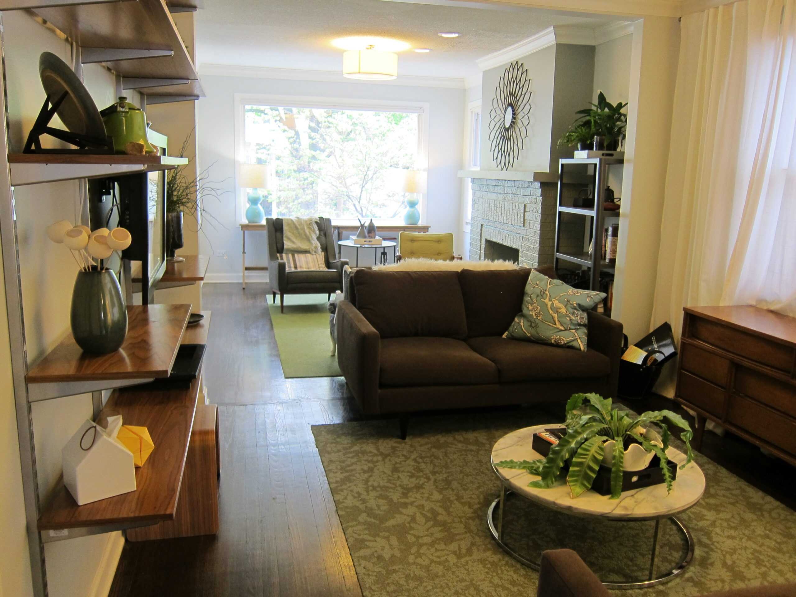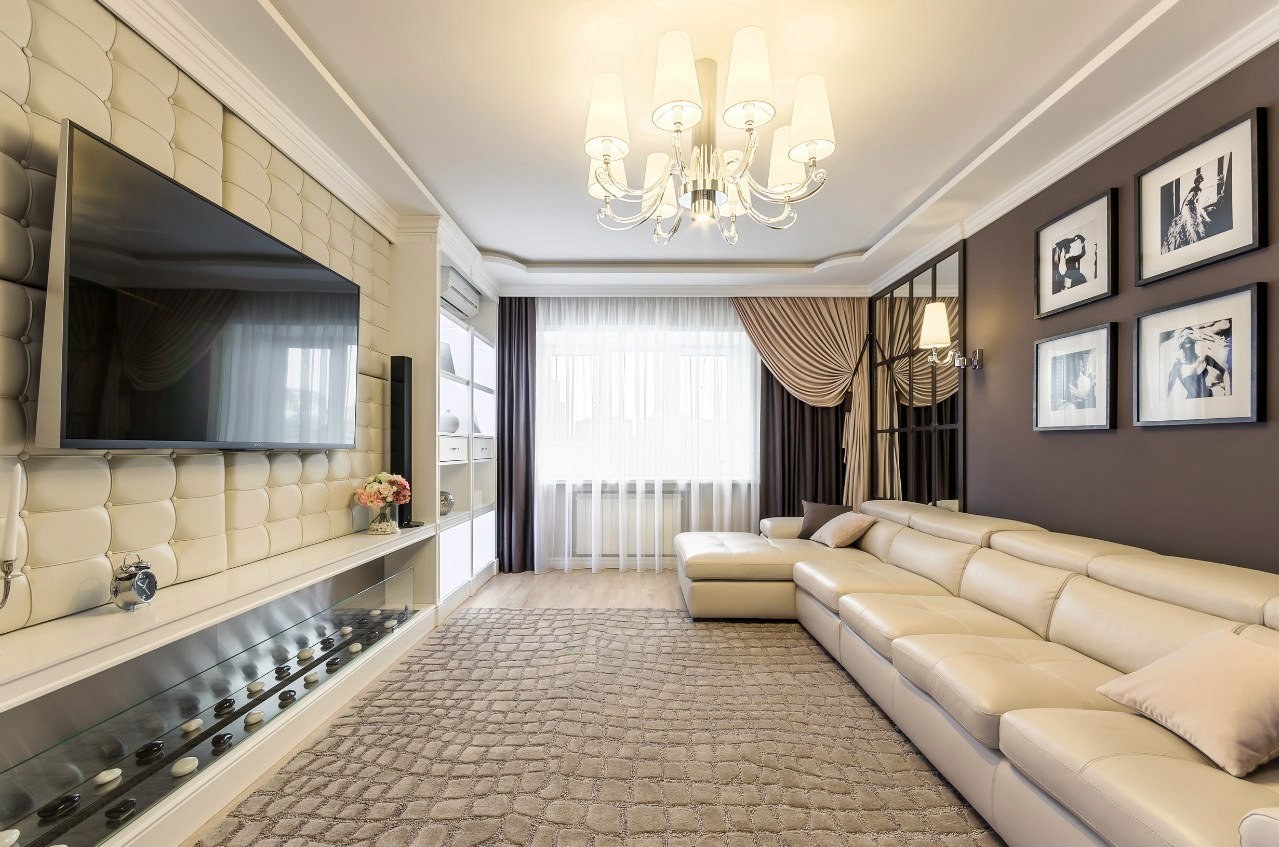 Интерьер узкой гостиной