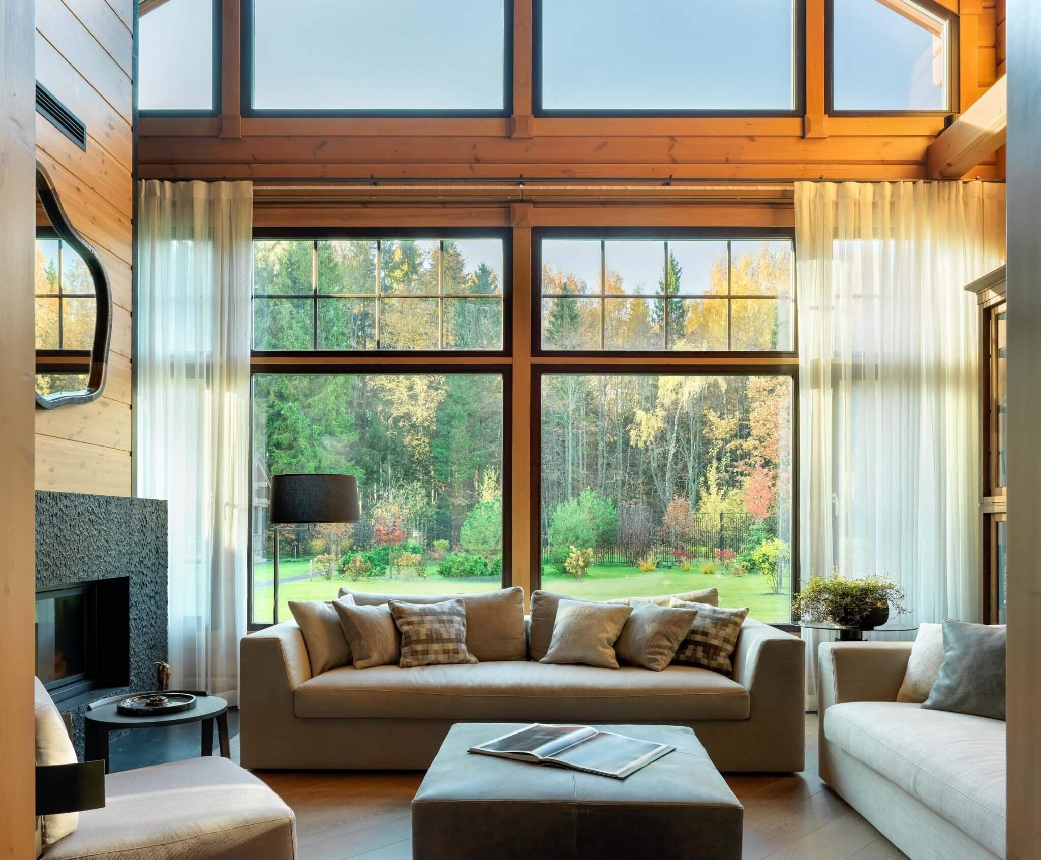 Гостиная с панорамными окнами в частном доме