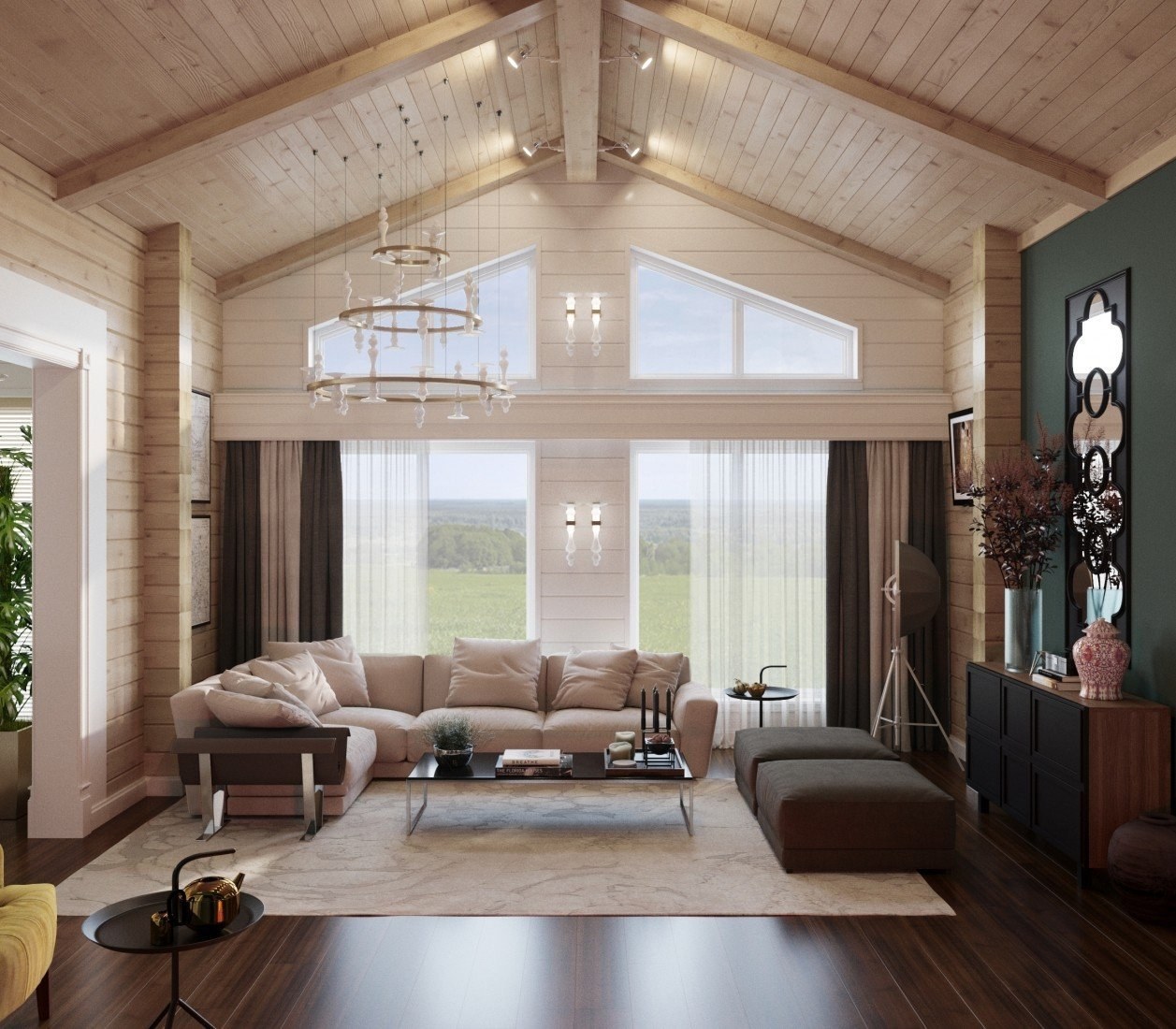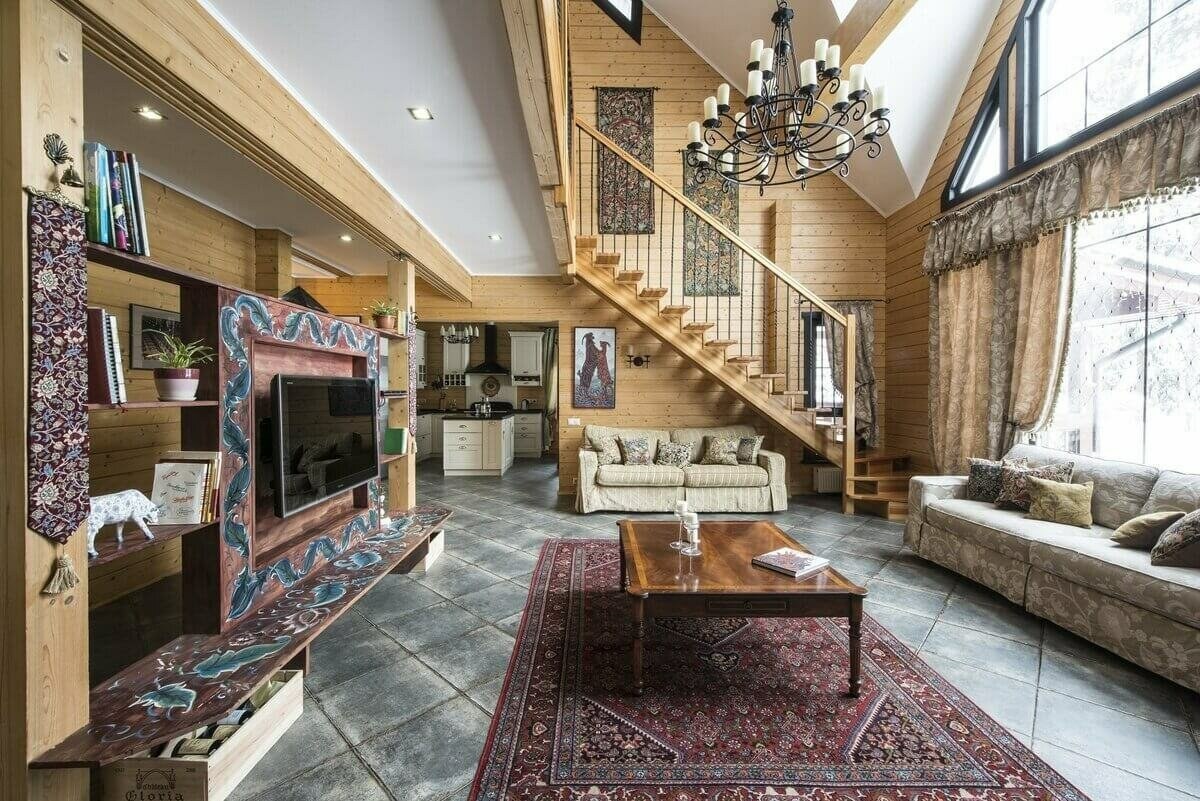 Экостиль в интерьере гостиной загородного дома