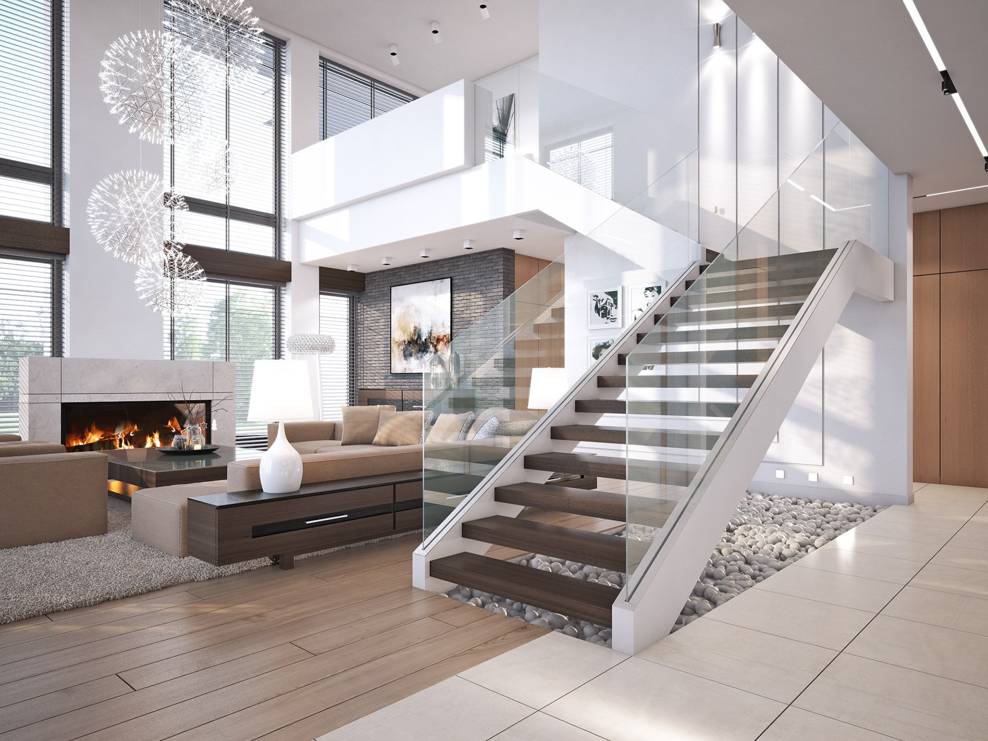Современная гостиная с лестницей