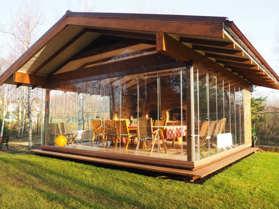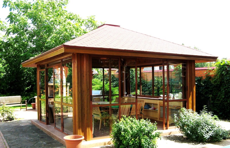 Стеклянная беседка для дачи с мангалом (72 фото)