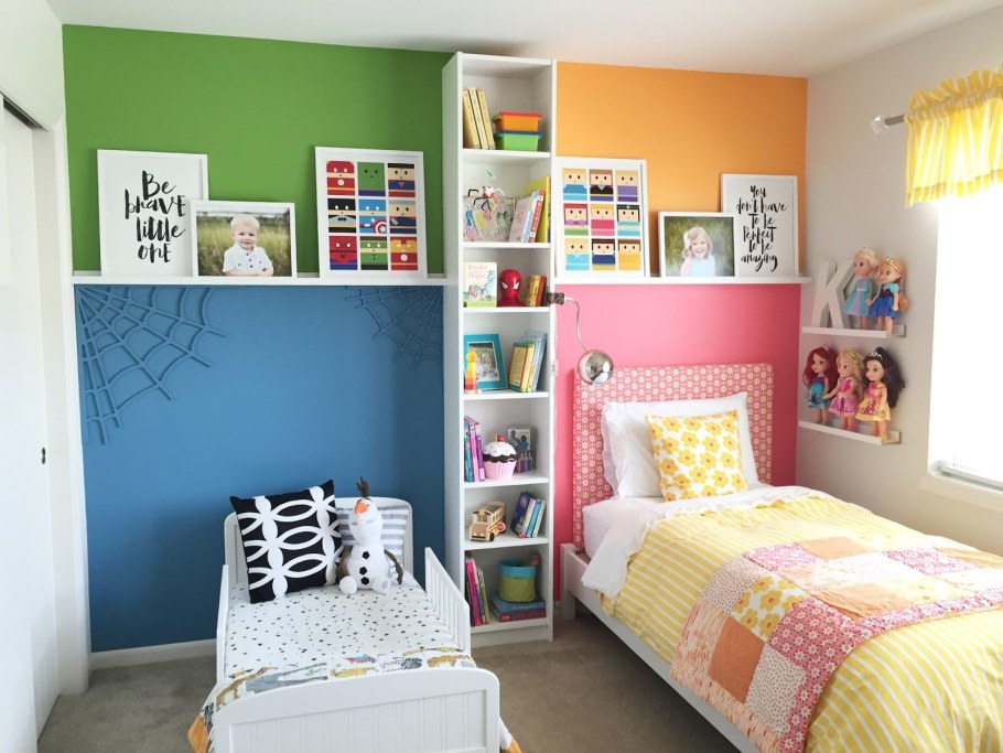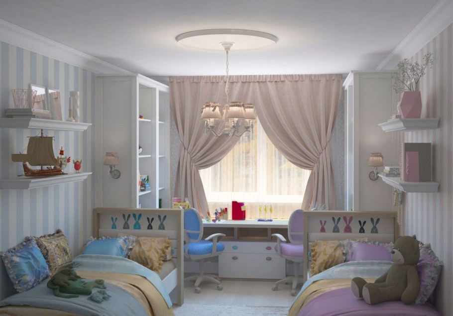 Интерьер узкой детской комнаты для двоих разнополых детей
