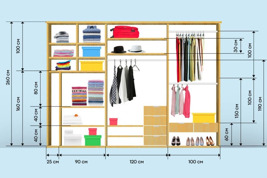 Наполнение шкафа купе 3 метра 4 двери с размерами