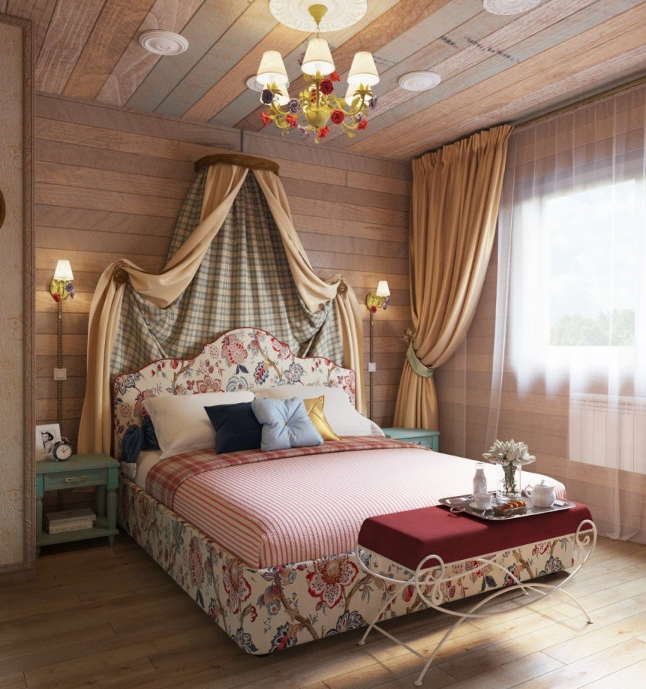 Интерьер спальни в бревенчатом доме в стиле Прованс