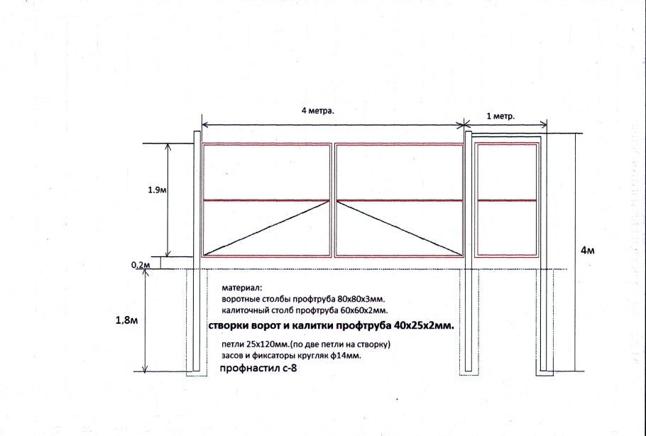 Ворота металлические распашные 4000х4300 с калиткой чертеж
