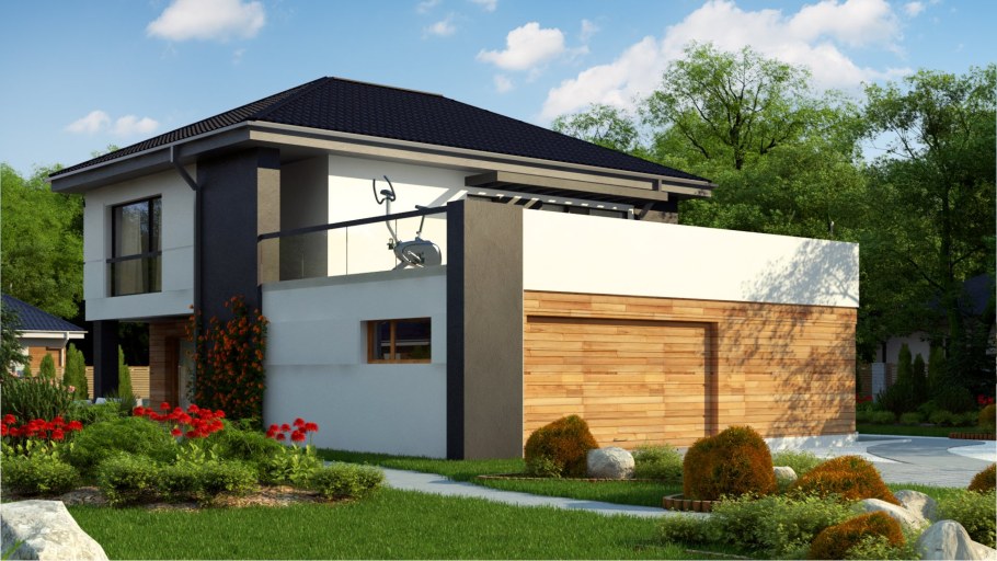 Двухэтажный дом в стиле Модерн с вальмовой крышей