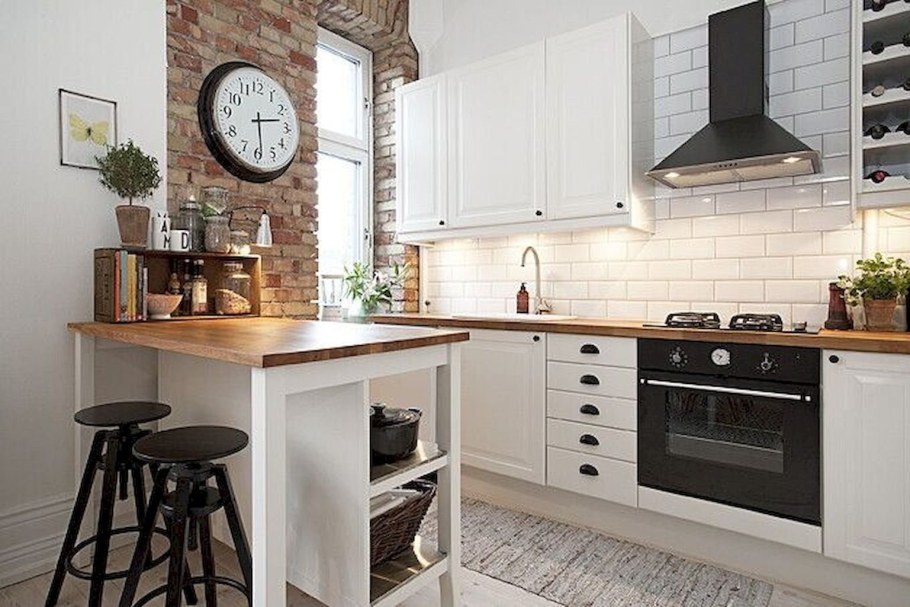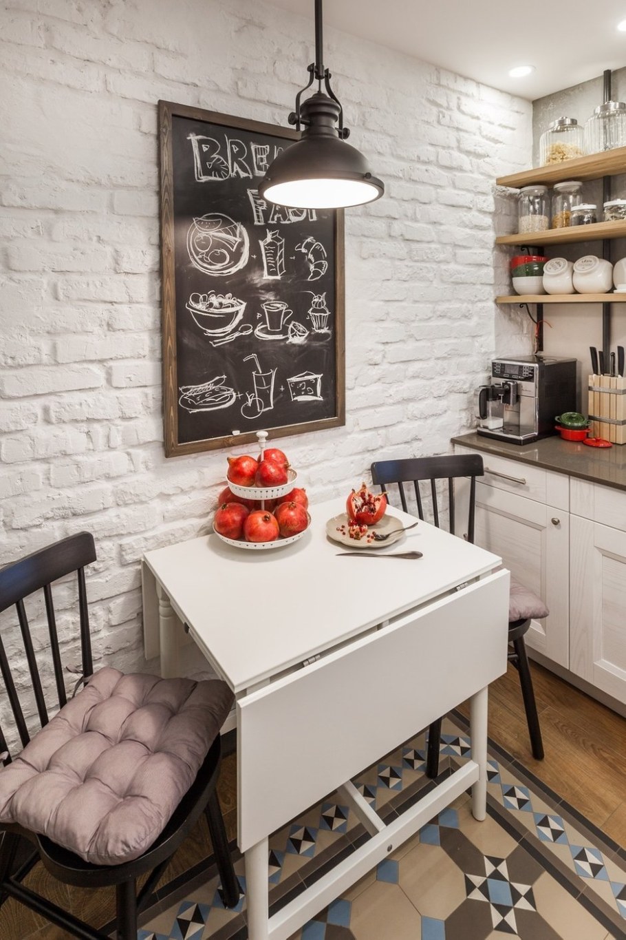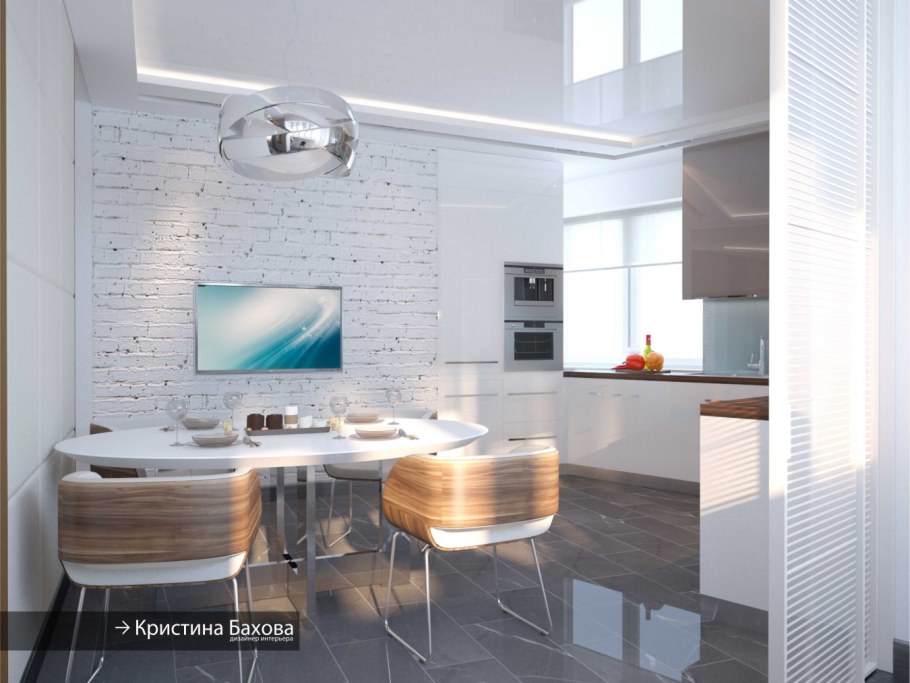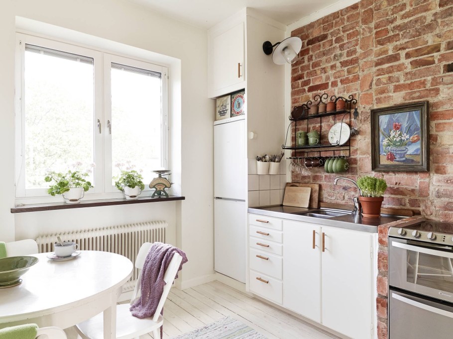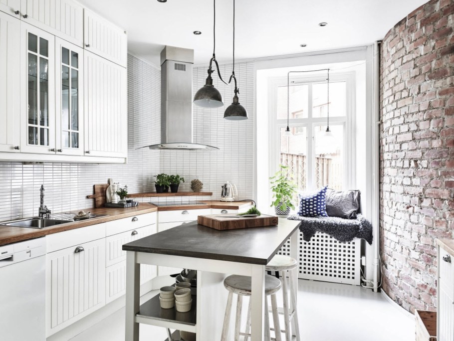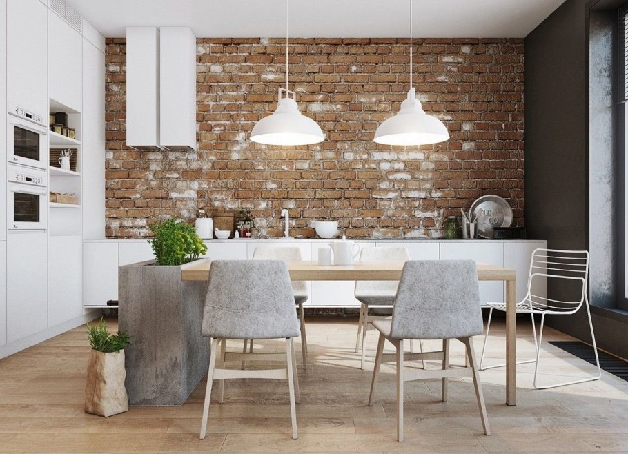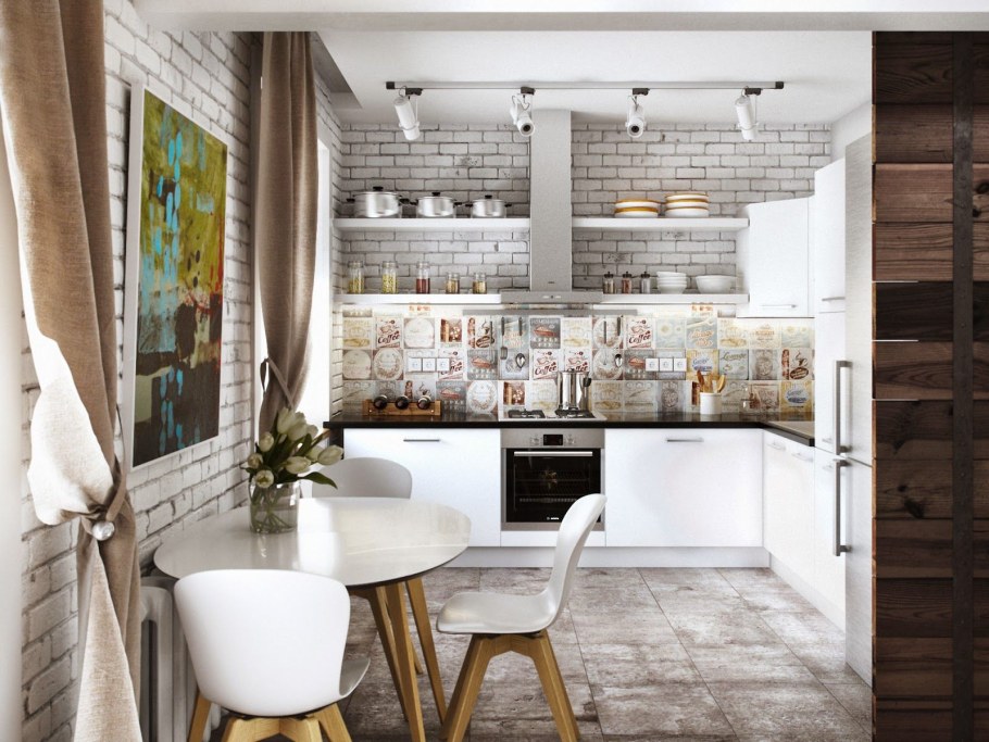Белая кухня с кирпичной стеной дизайн (71 фото)