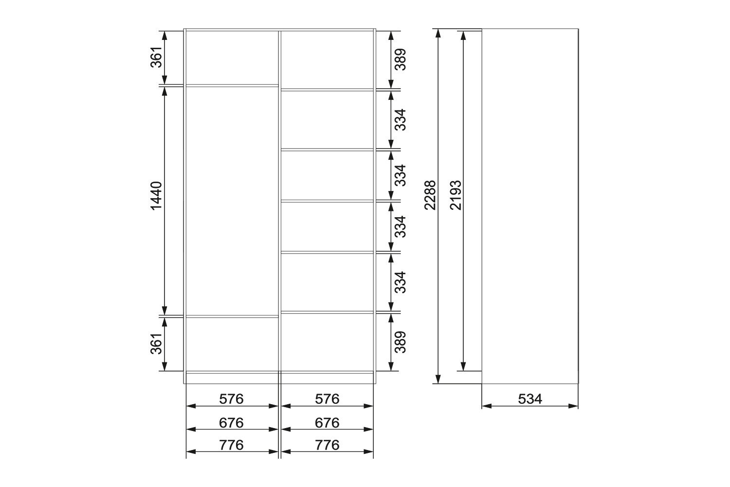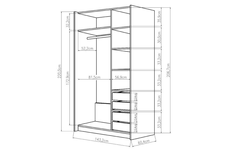 Чертеж шкафа с распашными дверцами с размерами