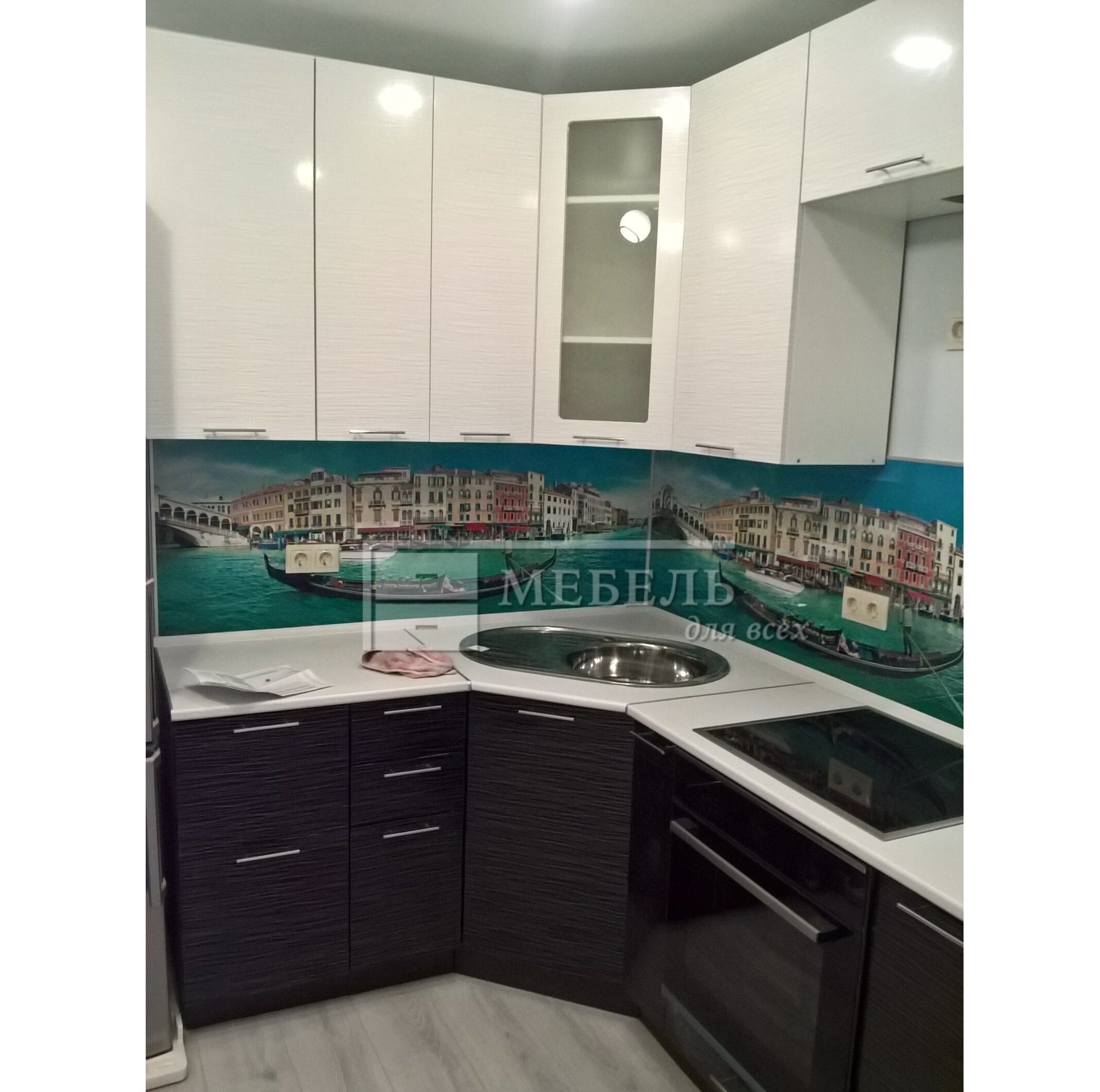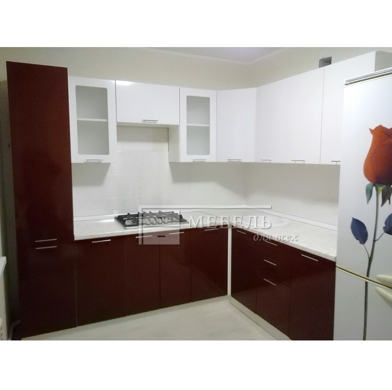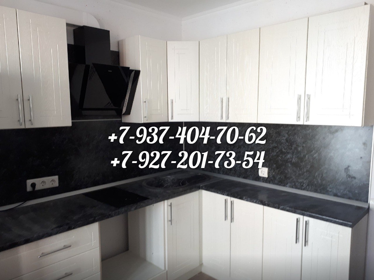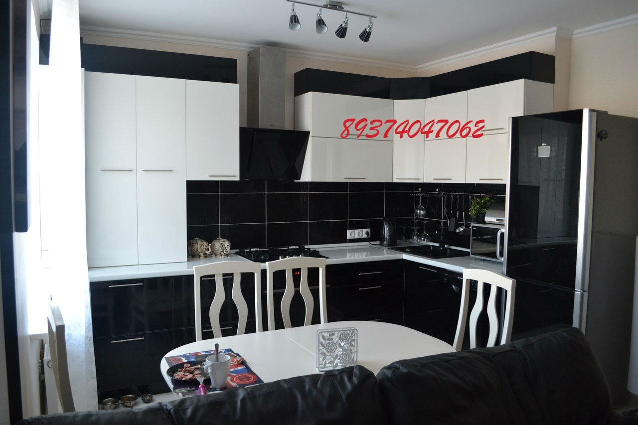 Угловая белая глянцевая кухня с черной столешницей 8кв м