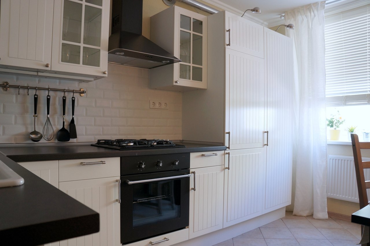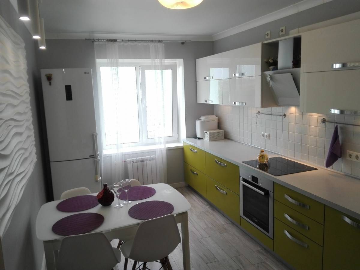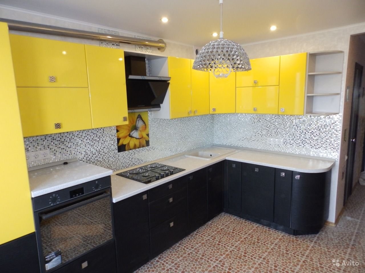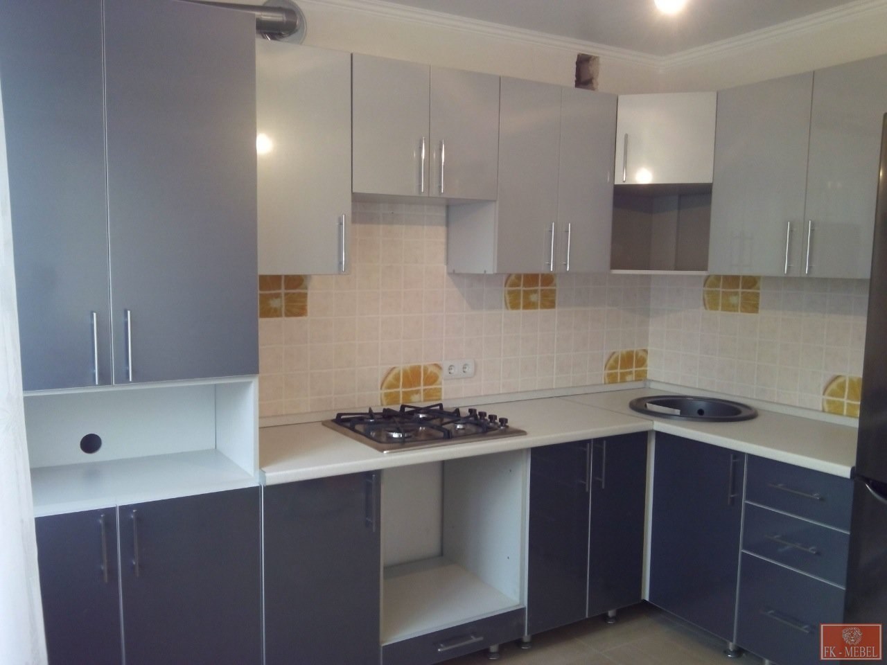 Угловая белая глянцевая кухня с черной столешницей 8кв м