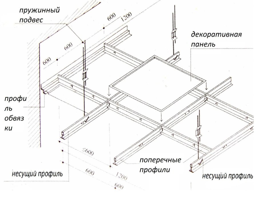 Схема крепления потолков Армстронг 1200х600