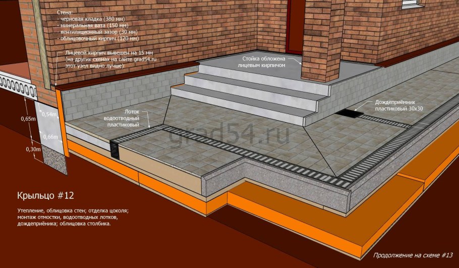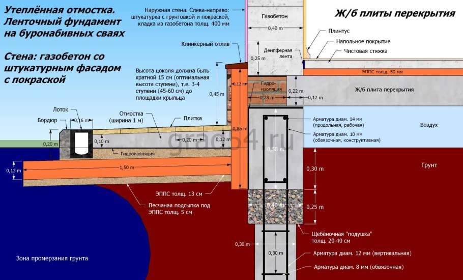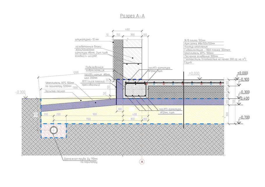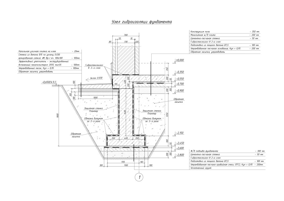 Узел примыкания монолитной плиты фундамента дома к плите террасы.