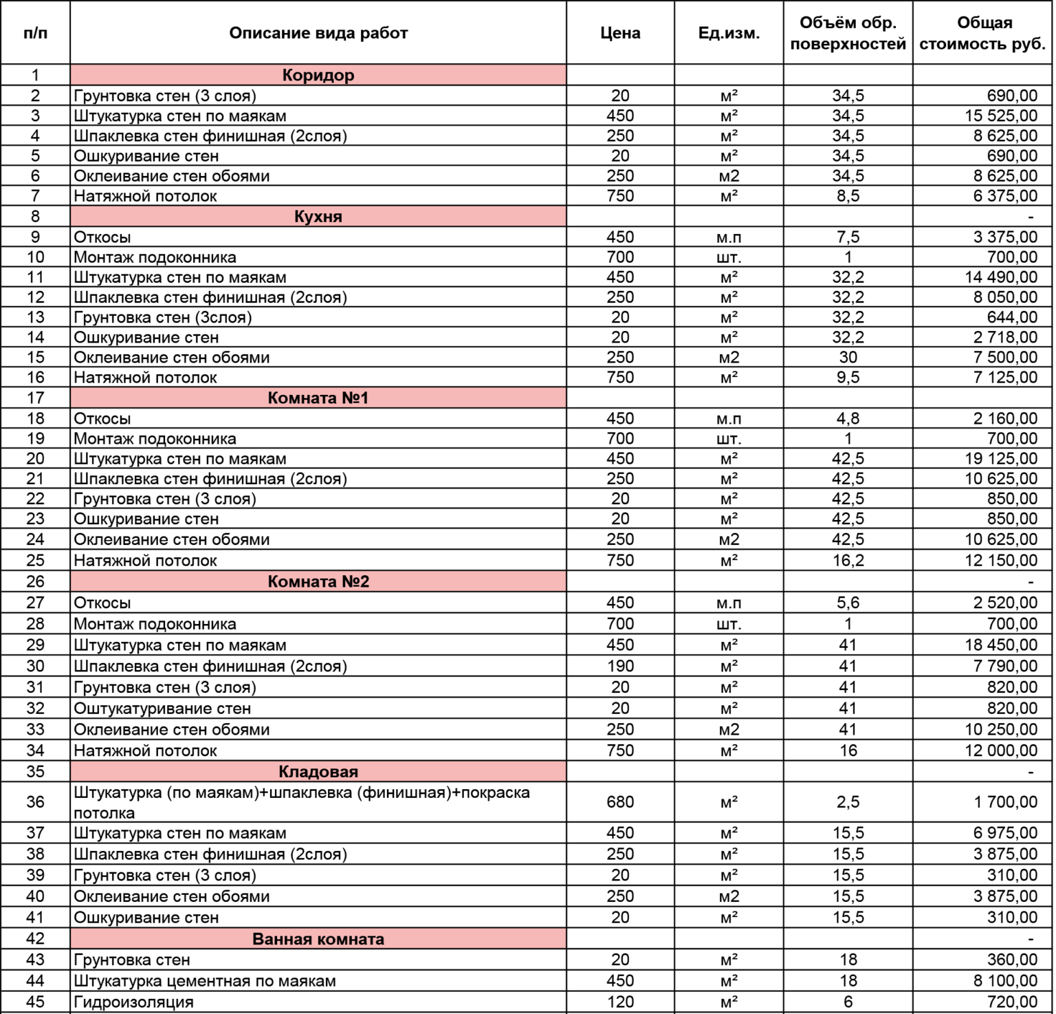 Смета материалов для черновой отделки
