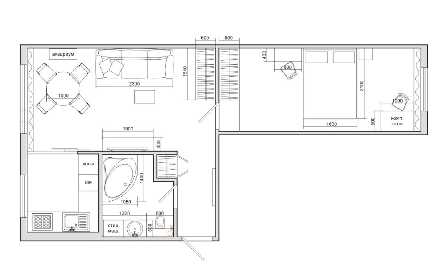 План 1 комнатной квартиры с размерами чертеж